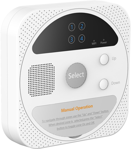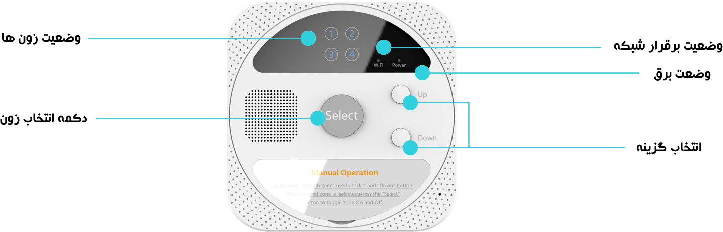 در زیر شما می توانید با عملکرد کلی سیستم آبیاری هوشمند آشنا شوید. چراغ نمایشگر انتخاب زون مورد نظر جهت آبیاری هوشمند (باید توجه داشته باشید که این چراغ ها در مدل های 2و4و6و8 زون متغییر هستند) هر یک از این چراغ ها نشانگر زون فعال است. گزینه Select برای فعال سازی گزینه های انتخاب صورت دستی و گزینه بالا و پایین برای تغییر انتخاب شماست. کنترلر آبیاری هوشمند یک مغز متفکر برای اجرا فرامین آبیاری هوشمند است. این کنترلر این ویژگی را دارد تا شما همزمان بتوانید بصورت دستی آن را فعال و غیر فعال کنید. چراغ نمایشگر WiFi وضعیت صحت اتصال کنترلر آبیاری هوشمند را به شبکه داخلی خانه هوشمند شما نشان می دهد.